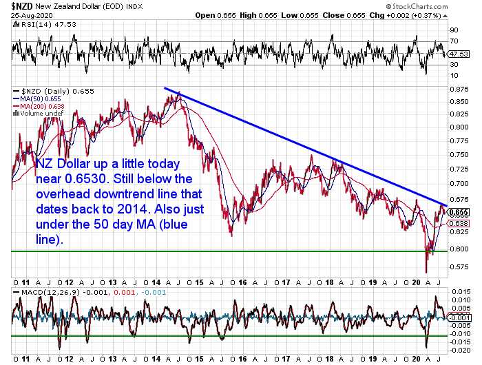 The NZ dollar has also dipped this week. Turning lower after touching the overhead downtrend line dating back to 2014. The Kiwi is now under the 50 day moving average. Odds are it could head a bit lower yet too. Maybe down to around 0.64 which would also be the 200 day MA?